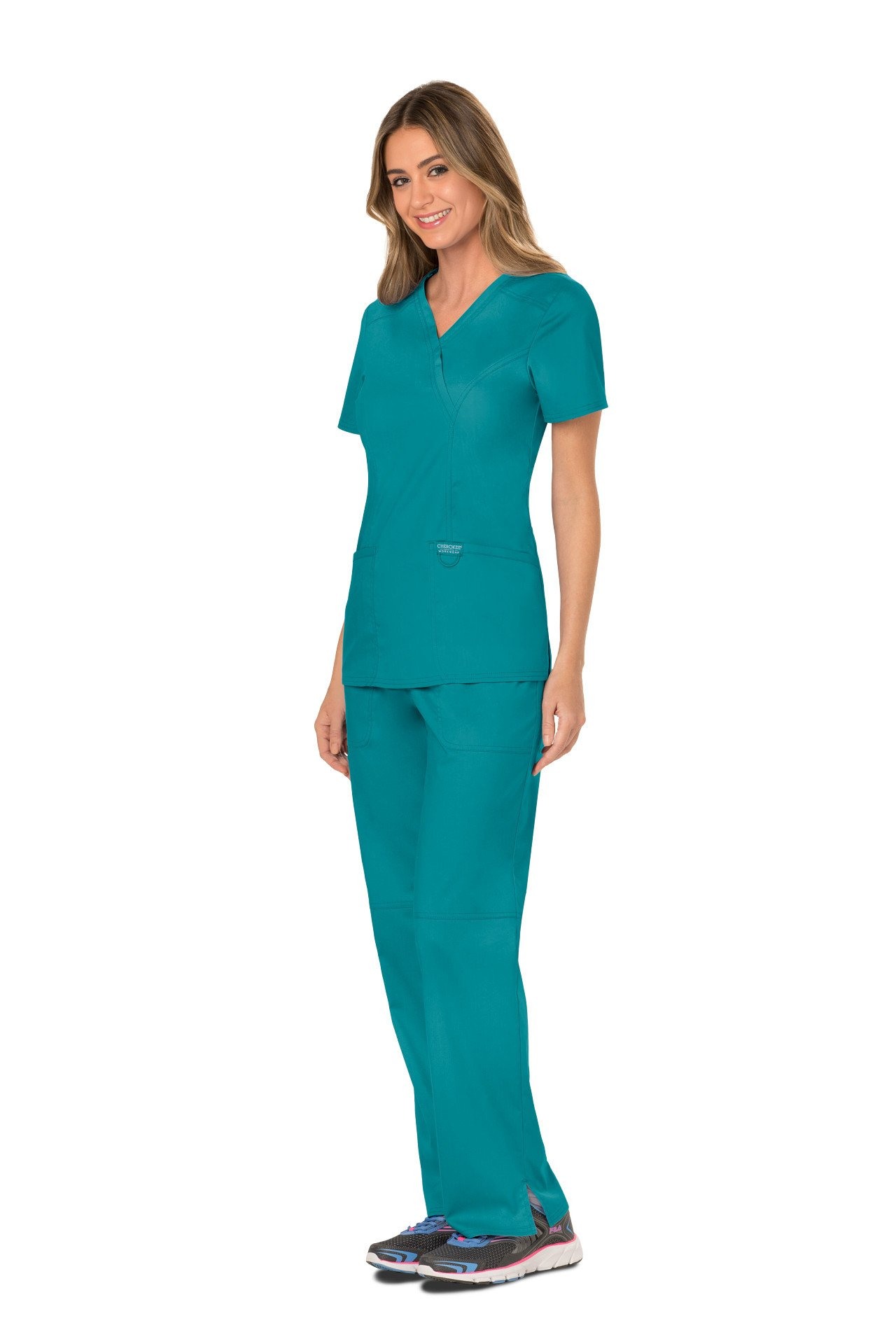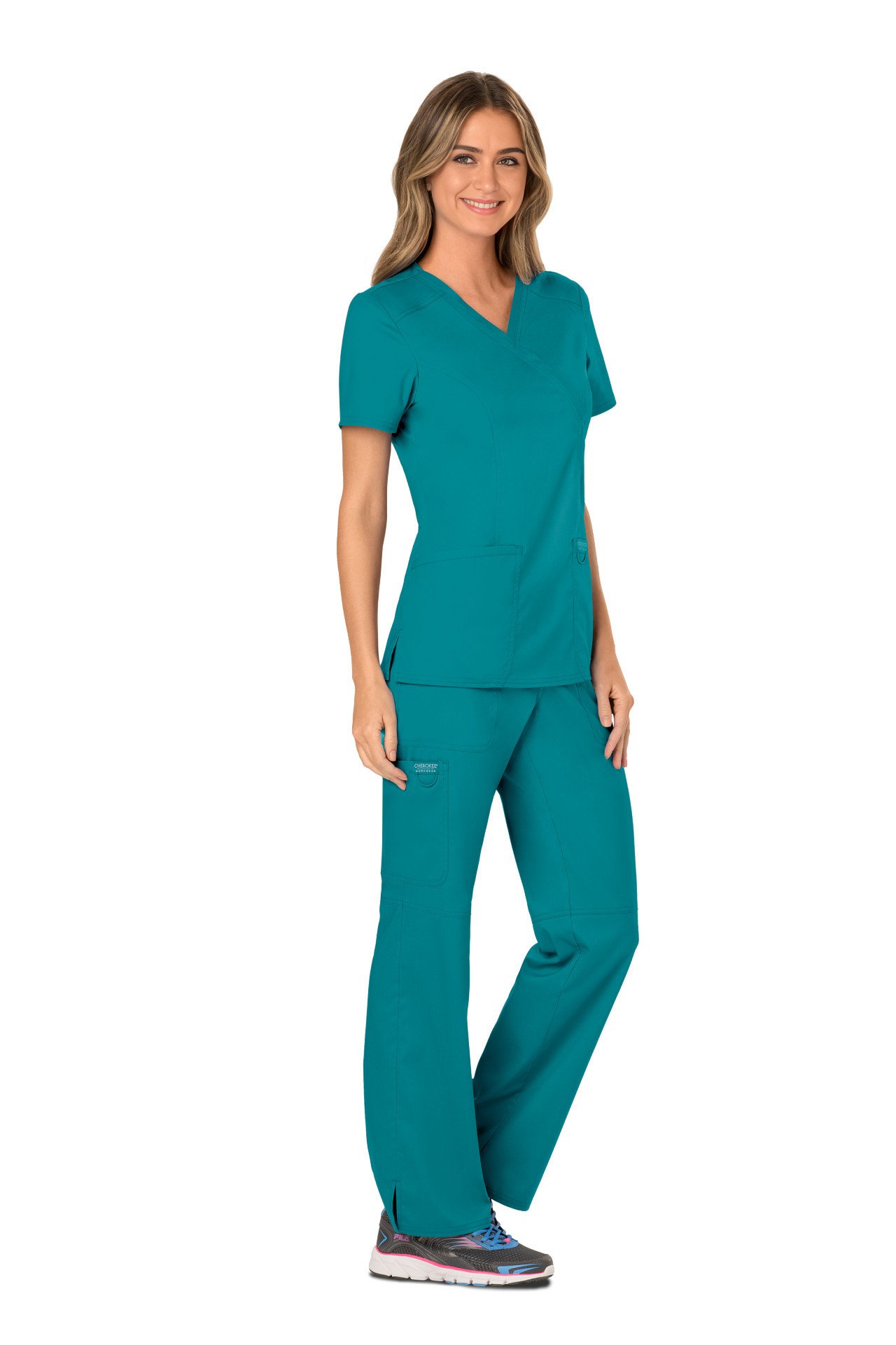 The Cherokee Revolution WW610 Women's Mock Wrap Top From the Cherokee Revolution range is this Women's Mock Wrap Top in a modern classic fit. A flattering and comfortable scrub top to fit all body types.