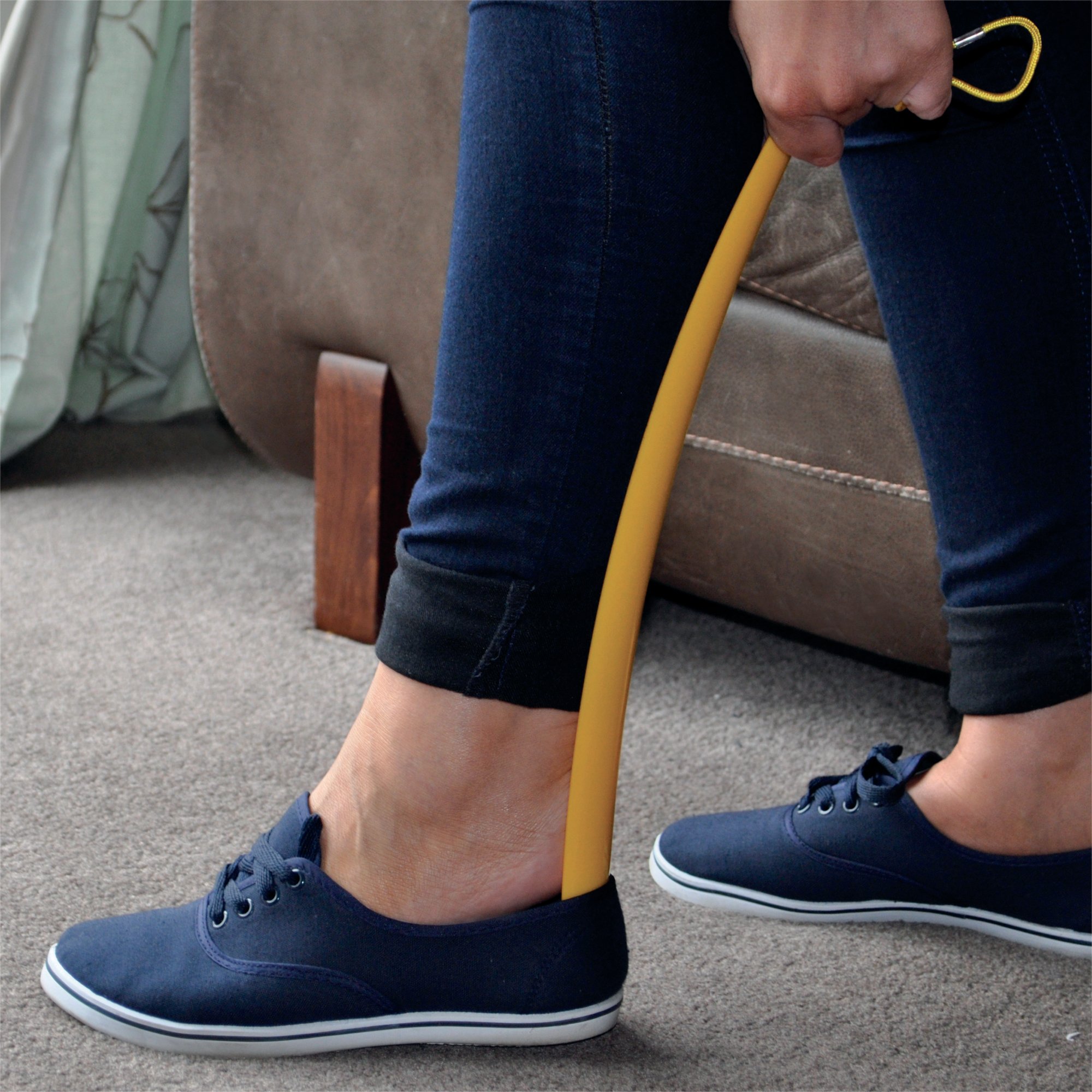 A conventionally shaped Plastic Shoehorn with extended length for easier use. This sturdy shoehorn is a handy dressing aid featuring a hook for positioning shoes and a hanging loop for storage. Supplied in yellow.