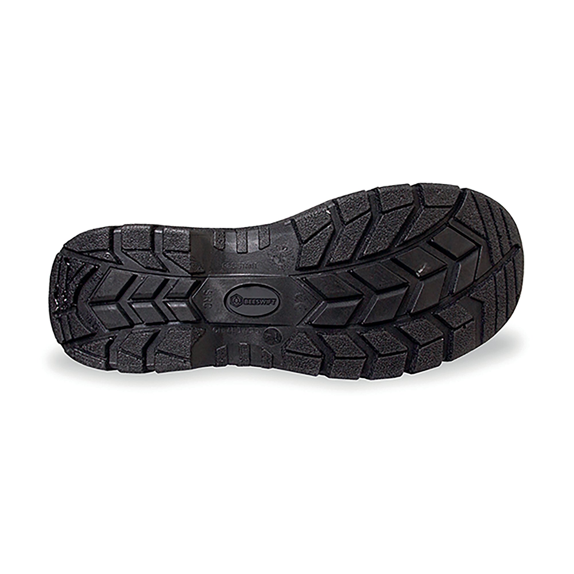 The Beeswift Chukka steel toe cap 4-D Ring safety boot with a PU padded collar and tongue and leather uppers. Includes a 200 Joule steel toe cap and a steel midsole, with a PU oil resistant sole. The boot features an energy absorbing heel to reduce foot fatigue and is slip resistant. Meets standard EN ISO 20345:2022 SBP E FO SR.