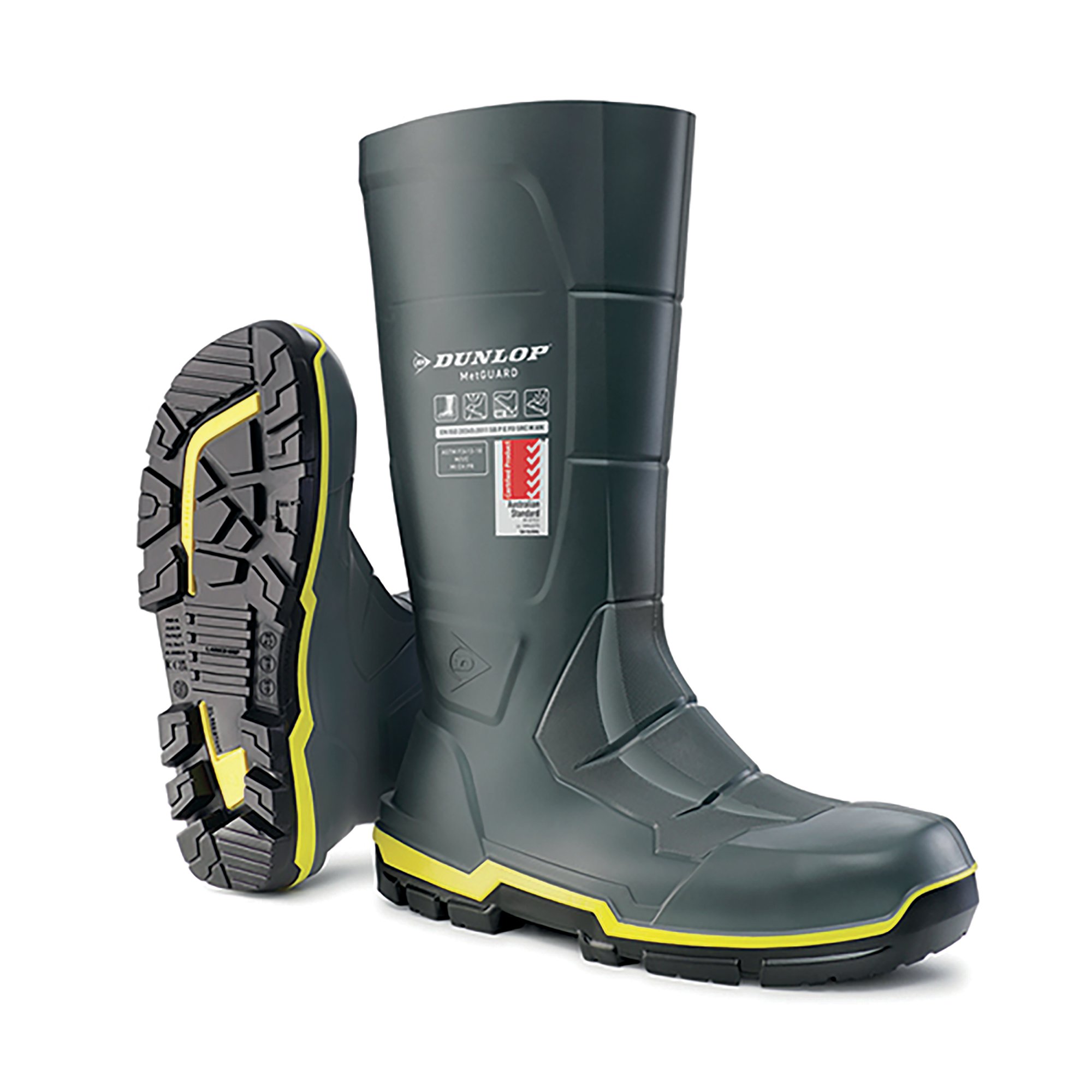 Dunlop Acifort Metguard Dual Density Full Safety Boot with an EN-certified metatarsal and ankle protection, keeps you safe for the toughest jobs. Dual-density mid layer absorbs impact energy with every step. Dunlops Acifort provides extra chemical protection from fuel and acids. SRC rated outsole designed for maximum grip on the toughest terrains. Tread wear indicator to monitor outsole performance. Steel toecap and midsole protection, with an energy absorbing sole. Meets Standard EN ISO 20345:2011 SB P E FO SRC M AN.